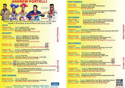 Welcome to the Download Page, Melbourne Elvis Impersonator Tribute Artist and Rock ‘N’ Roll Entertainer Andrew Portelli. Here you will find many downloads including songs, Youtube Video’s, Posters, Show Dates, Music Resume, References, Song List. just click on the above link and enjoy.